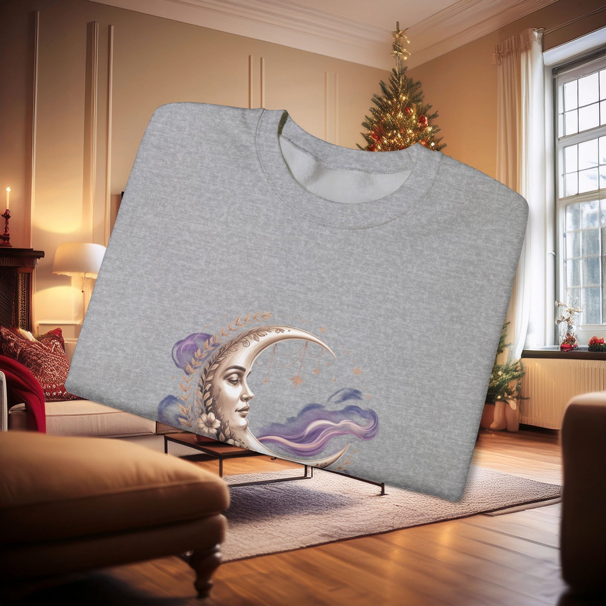 A softly ornate celestial sweatshirt blending 90s-inspired moon-and-star motifs with a whimsigoth mood. The artwork pairs a crescent moon face, drifting clouds and subtle handwritten accents in muted mauve and gold tones for a nostalgic, slightly romantic look that reads as both dreamy and darkly elegant. Lightweight enough for layering, it reads like wearable decor for anyone drawn to mystic-celestial aesthetics and vintage-inspired alt fashion.