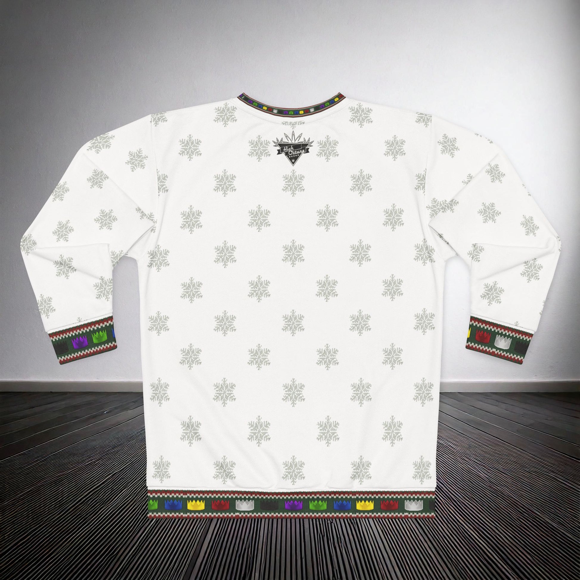 Featuring a vibrant, all-over red design studded with snowflakes, the centerpiece is a pixelated crown that every player will instantly recognize and crave. Finished with knitted-style cuffs and hem, this sweater is perfect for your next holiday party, a late-night quest, or a cozy fireside skill grind.