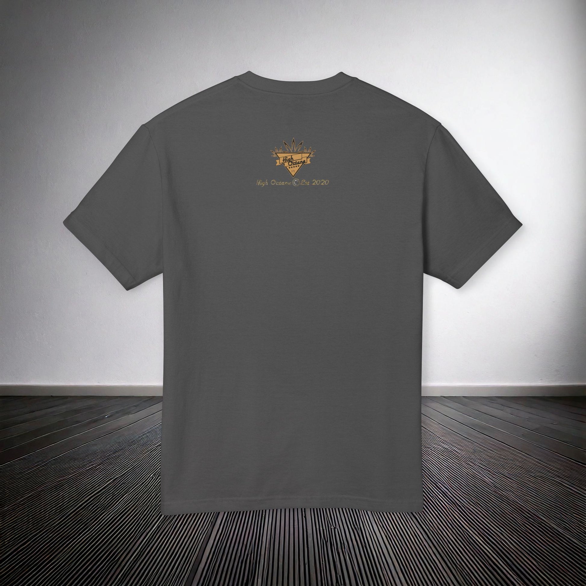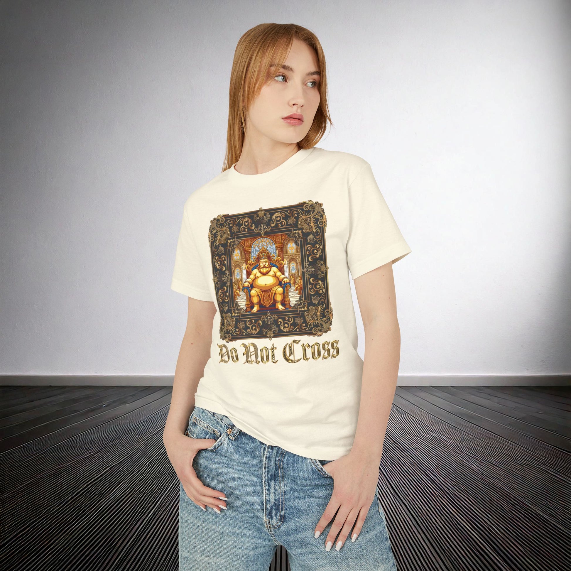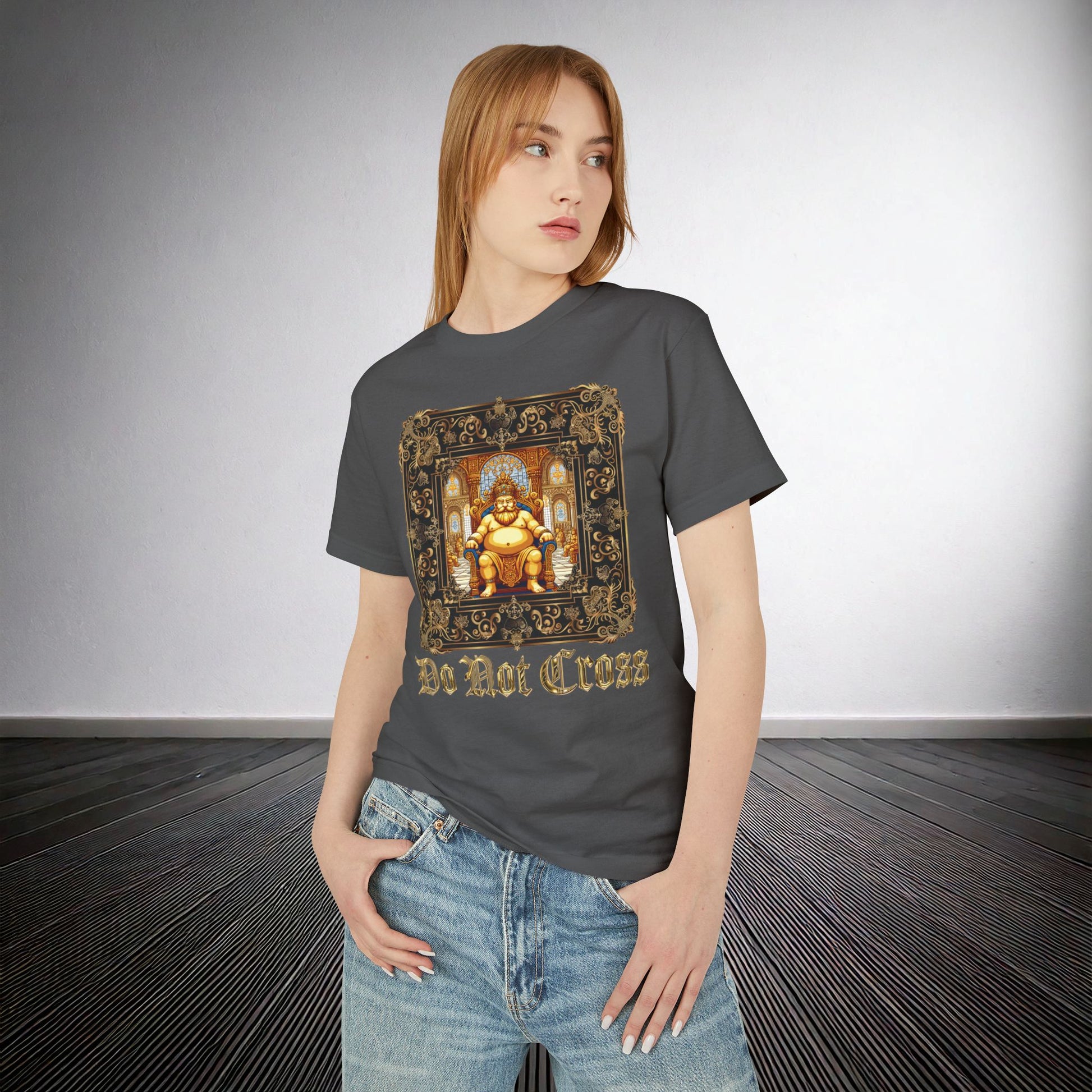 A vintage-inspired heavyweight cotton tee featuring a unique design that reads 'Do not cross A king and his treasure'. This relaxed-fit shirt is made of 100% cotton, with a wide rib collar and shoulder and neck taped seams for durability and comfort. Perfect for those who appreciate quality, sustainable fashion with a touch of royalty.